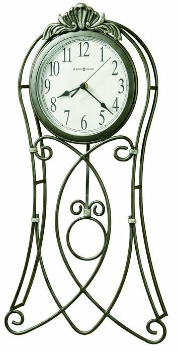 The Shannon Wall Clock by Howard Miller is a wrought-iron clock with bent iron, scrollwork and a decorative cast crown finished in warm gray with nickel accents.