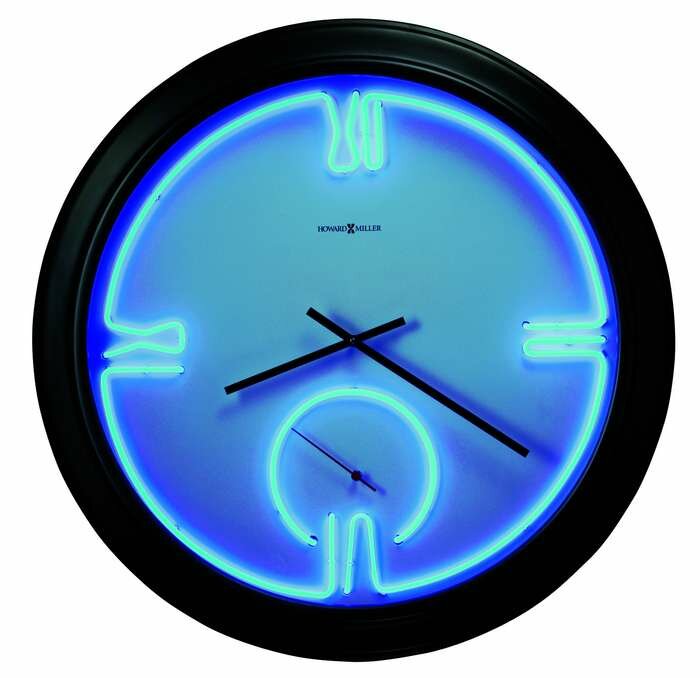 The Gallery Neon Wall Clock by Howard Miller features a black satin polyurethane frame and white dial that serves as the backdrop for the bold blue neon numerals on this exciting 32" clock.