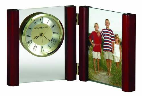 The Alex Table Clock by Howard Miller is a Hinged wood and glass alarm clock and picture frame with profiled Satin Rosewood Hall-finished side columns, holds a standard 4" x 6" photo.
