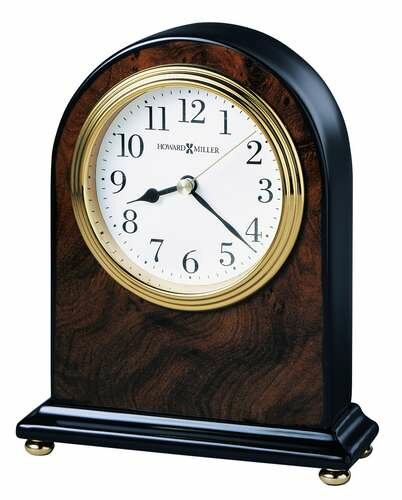 The Bedford Table Clock by Howard Miller is an Arched table clock offering High-gloss walnut piano finish with a wood burl pattern on the front and back. Sides and base are ebony black, with polished-brass button Feet.