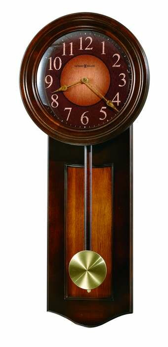 The Avery Wall Clock by Howard Miller has a Rustic Cherry finish with contrasting Vintage Umber inset panel.