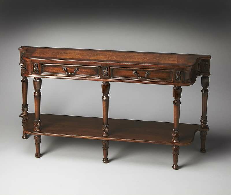 Crafted from select hardwood solids and wood products, this grand console table features inspired veneer work in cherry and ash burl with gold-tip accents, plus two drawers with complementary brass-finished hardware and a bottom display shelf. Finished in a rich Olive Ash Burl. Light Distressing. Made using . Some Assembly Required. Ships via Freight Truck.