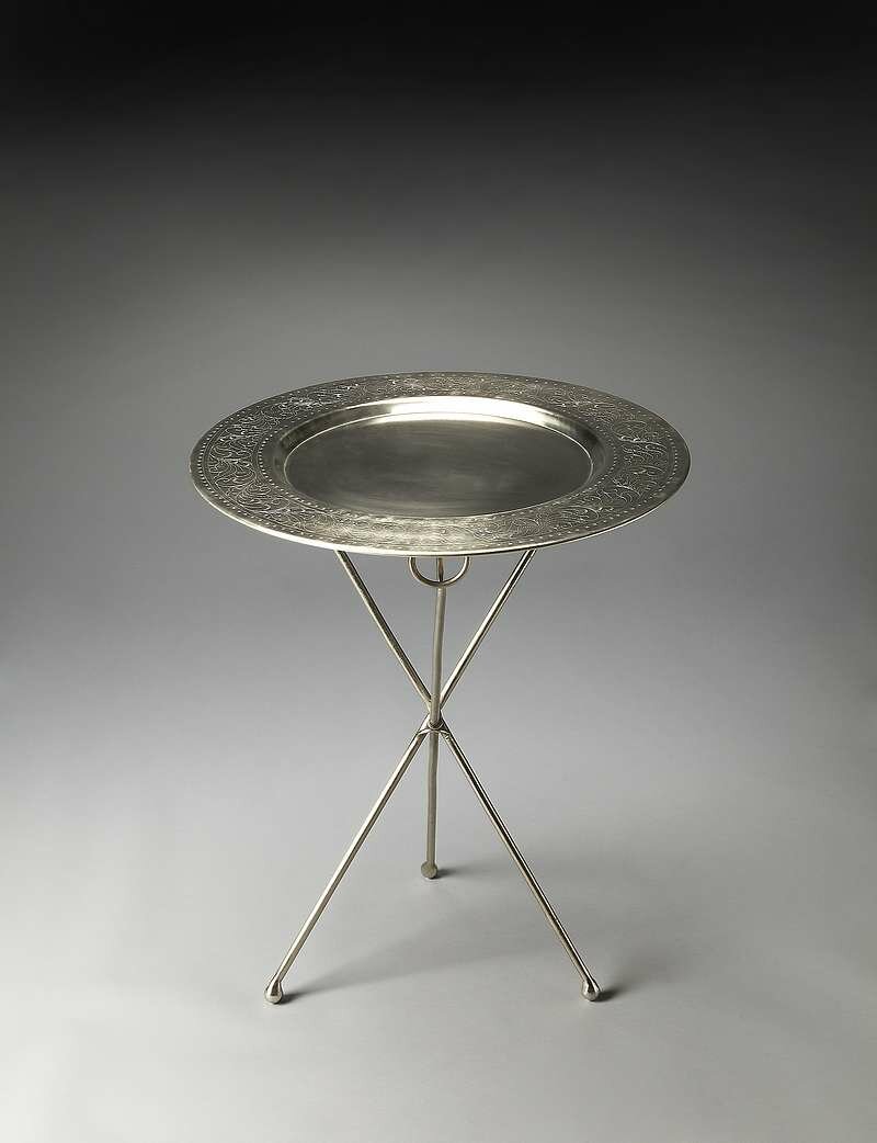Featuring a tabletop with a gleaming center and exquisitely etched border atop three legs crossed and tied in the center, this simply elegant Accent Table glows. No Distressing. Made using Aluminum. Some Assembly Required. Ships via UPS/FedEx.