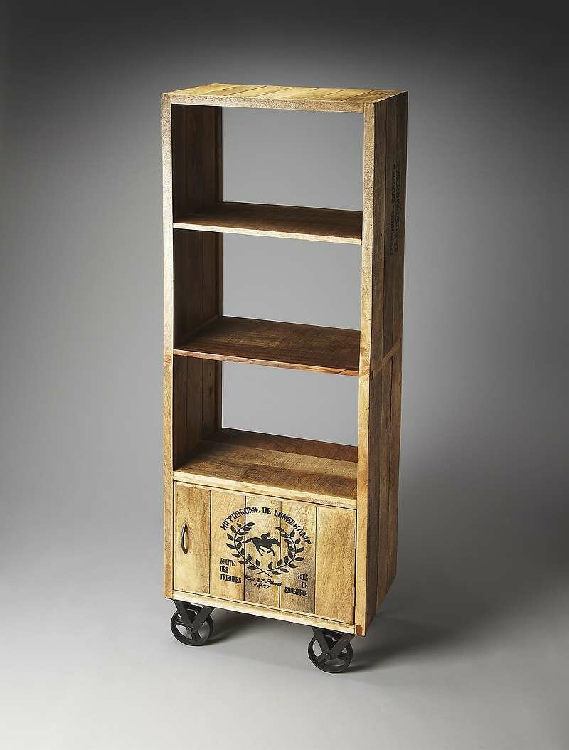 Sitting comfortably in the fashion-forward, post-modern industrial zone, this fashionably unconventional Bookcase curiously celebrates an 1857 Hippodrome in France. Crafted from recycled solid wood in our Wet Sand finish, it comes equipped with iron wheels for mobility and complementary hardware to open the door. Moderate Distressing. Made using Mango wood solids, iron. Comes Fully Assembled. Ships via Freight Truck.