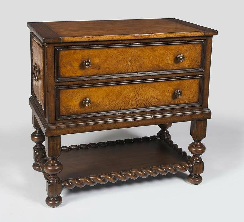 This manificent Drawer Chest features burl veneers on the drawer fronts, bold turnings on the legs, a rope border for the lower shelf, and antique brass-finished hardware. Abundant storage inside two drawers. Moderate Distressing. Made using Gemelina wood solids, MDF, leather, walnut, primavera and ash burl veneers. Comes Fully Assembled. Ships via Freight Truck.