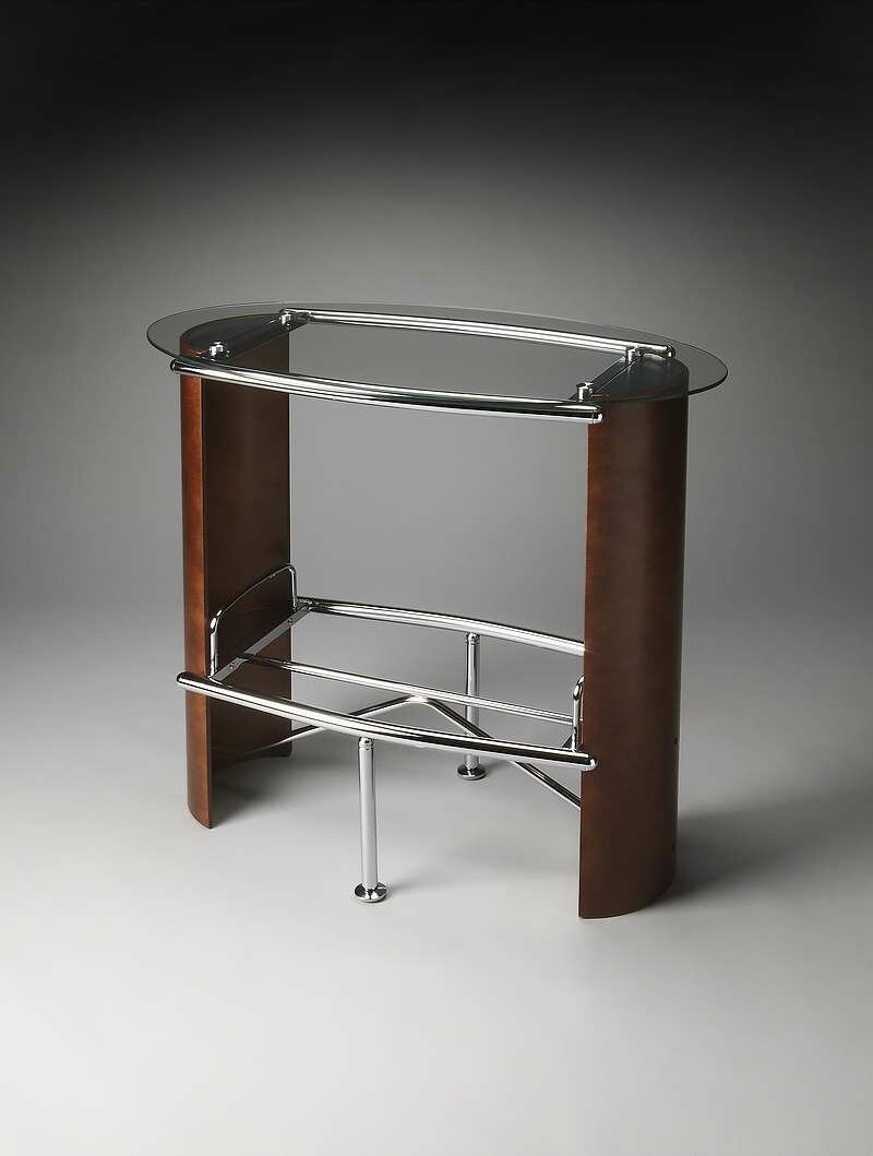 Dark Walnut with No distress finish. Made from Chrome Plated Metal Tube @31.8Mm, 22.2Mm,19.05Mm With Top 8Mm Clear Tempered Glass And.Aluminum Cylinders. Bentwood Sides In Basswood Finish.. Minor assembly required. Ships via UPS/FedEx.