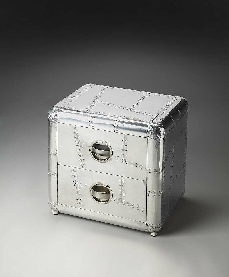 Crafted from polished and riveting aluminum, this bold Chairside Chest provides two drawers for substantial storage. It shimmers for sure… a brightest spot that absolutely will not be ignored. Moderate Distressing. Made using Aluminum, steel, MDF, wood solids. Comes Fully Assembled. Ships via UPS/FedEx.
