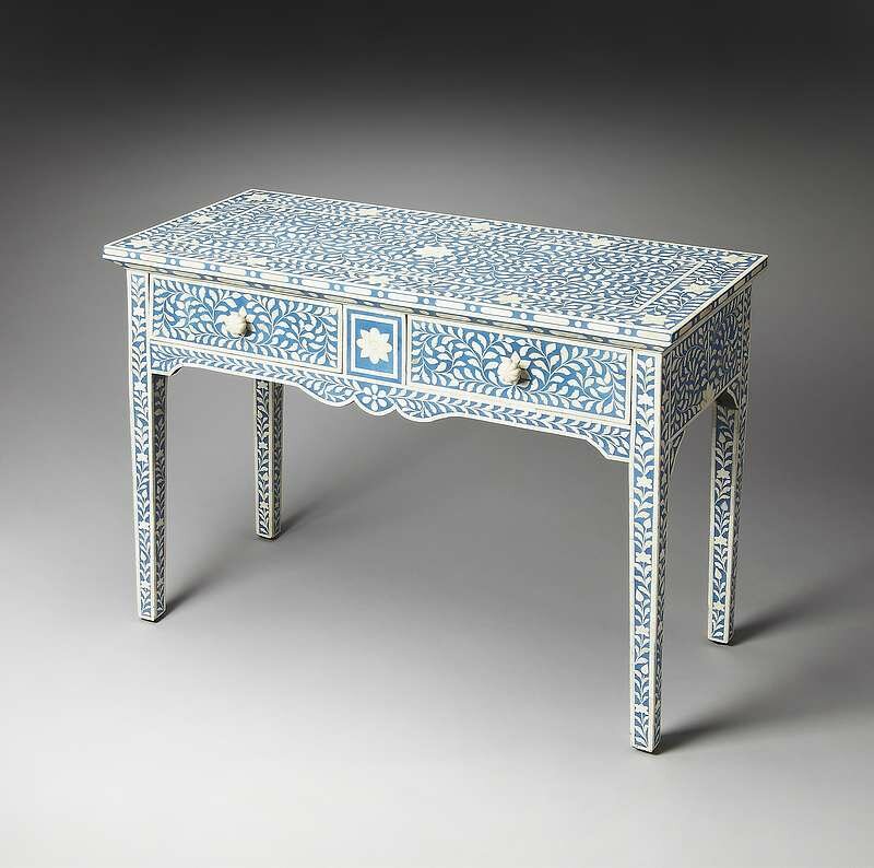 This captivating Console Table features sophisticated artisty and consummate craftsmanship.The botanic patterns covering the piece stem to stern are created from white bone inlays cut and individually applied in a sky of blue by the hands of a skillful artisan. No two tables are ever exactly alike, ensuring this piece will settle into its space as a bonafide original. Light Distressing. Made using Wood, MDF, Bone. Comes Fully Assembled. Ships via Freight Truck.