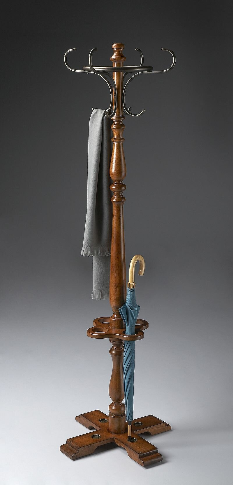 Selected solid woods, wood products and choice cherry veneers. Black finished metal coat hangers, center partition for umbrellas, and brass finished cups in base. Physically distressed finish. Some Minor Assembly Required. Ships via UPS/FedEx