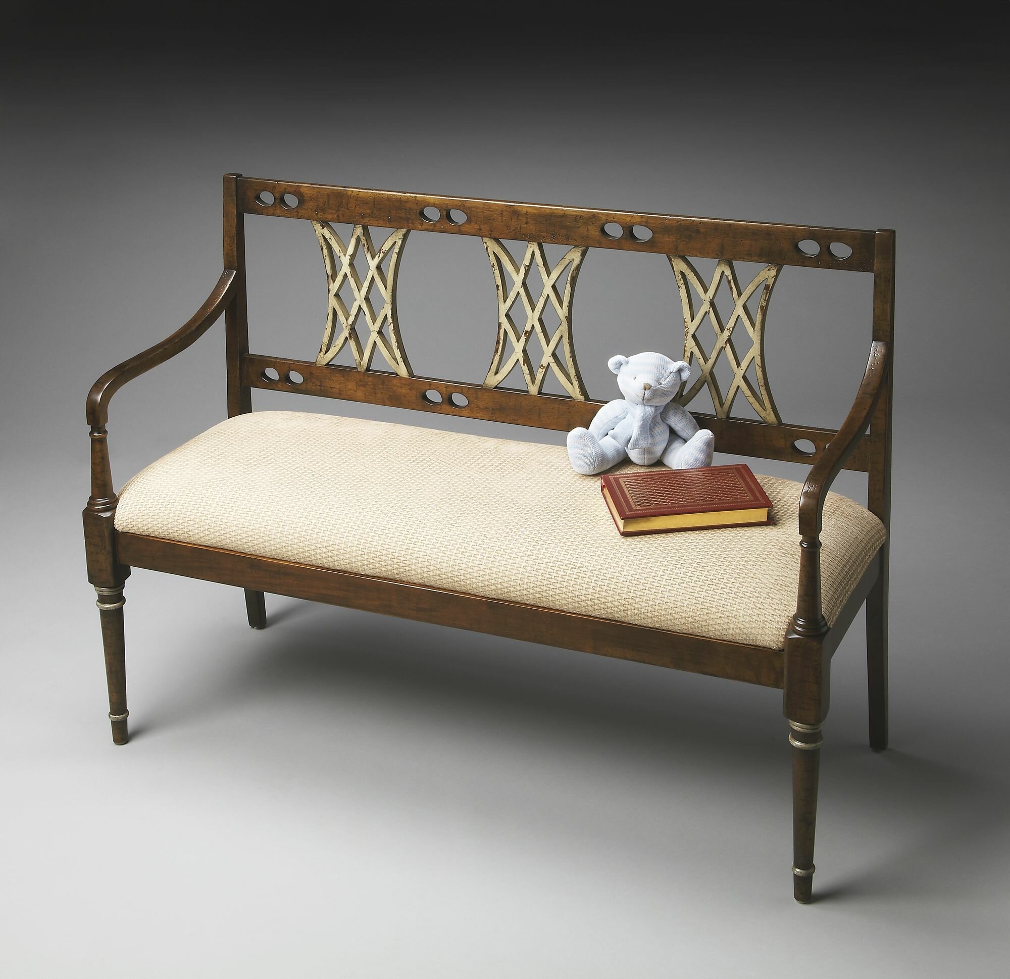 This stunning bench will be the focal point of virtually any space. Everything about it - from the aged two-tone Appaloosa finish, the hand carved back panel and clean lines - gives this bench an understated elegance all its own. Hand crafted from harwood solids and wood products, the seat cushion features an ivory colored chenille fabric. Fully Assembled. Ships via Freight Truck