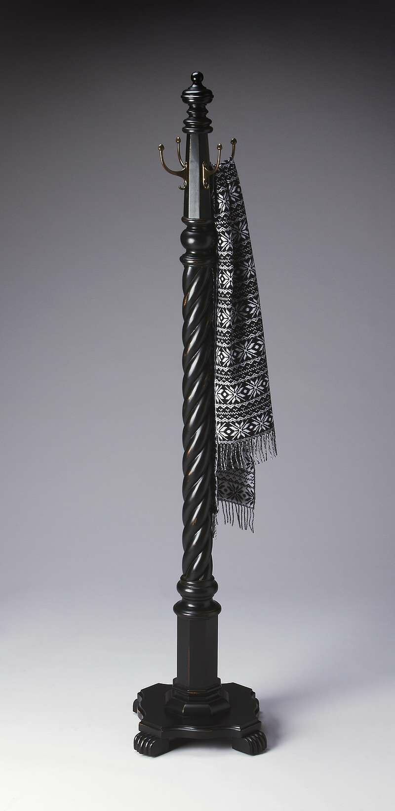 Selected solid woods, wood products and choice veneers. Hand carved details. Antique brass finished double hooks. Part of the Black Licorice Collection. Distressed Finish. Some Assembly Required. Ships via FedEx/UPS.