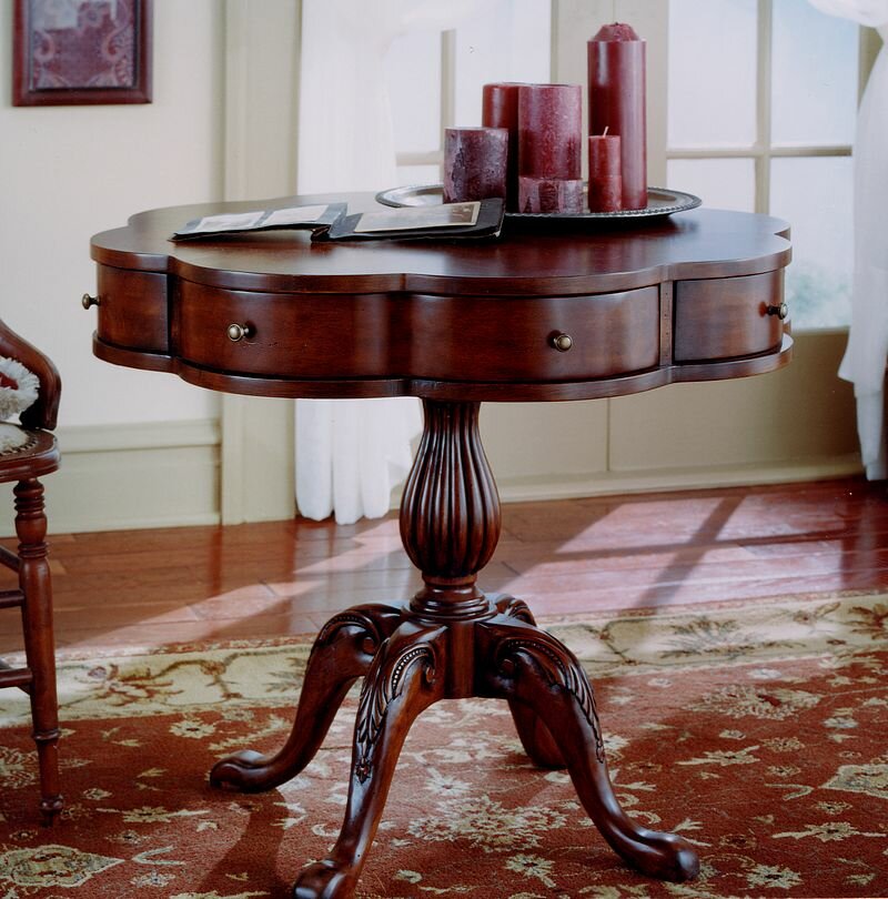 Selected hardwoods and choice veneers. Hand carved details. Veneer inlay top with end grain border. Two working drawers. Antique brass finished hardware. Some Minor Assembly Required. Ships via Freight Truck