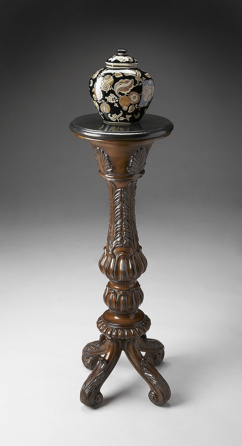 Perfect for displaying a beautiful vase, plant or floral arrangement, this elegant traditional pedestal is a wonderful finishing touch to virtually any space. Hand carved details, including acanthus leaves, adorn the base on up to the black fossil stone veneer top. Cast resin base and wood products. Fully Assembled. Ships via UPS/FedEx