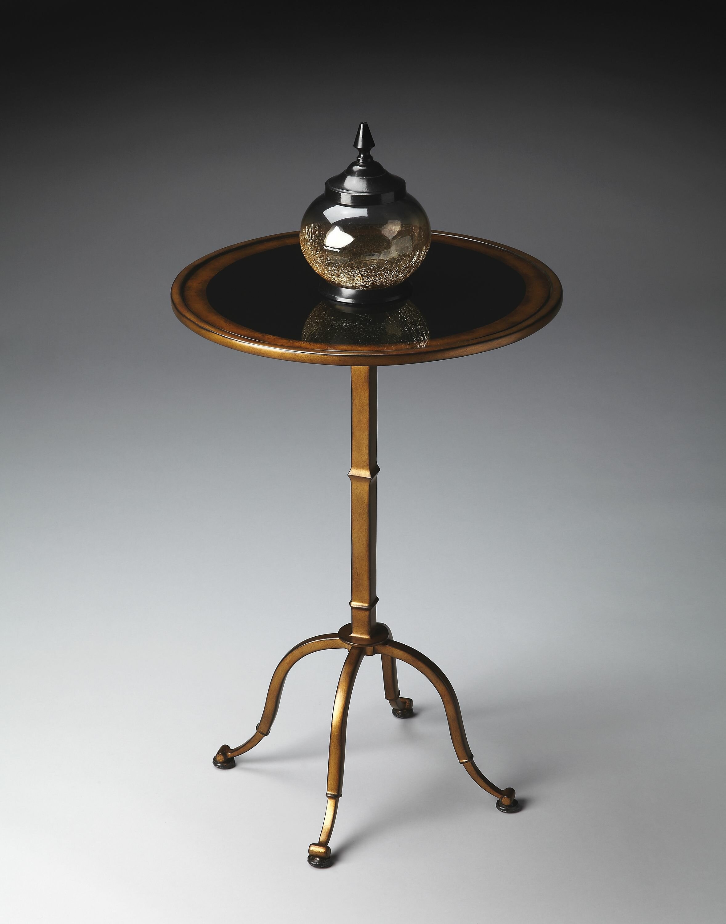 This exuberant accent table boasts an attention-grabbing reverse painted glass top framed in an aged cast-metal frame with a matching pedestal base. Designed to add a bright spot to an already beautiful room. Some Minor Assembly Required. Ships via UPS/FedEx