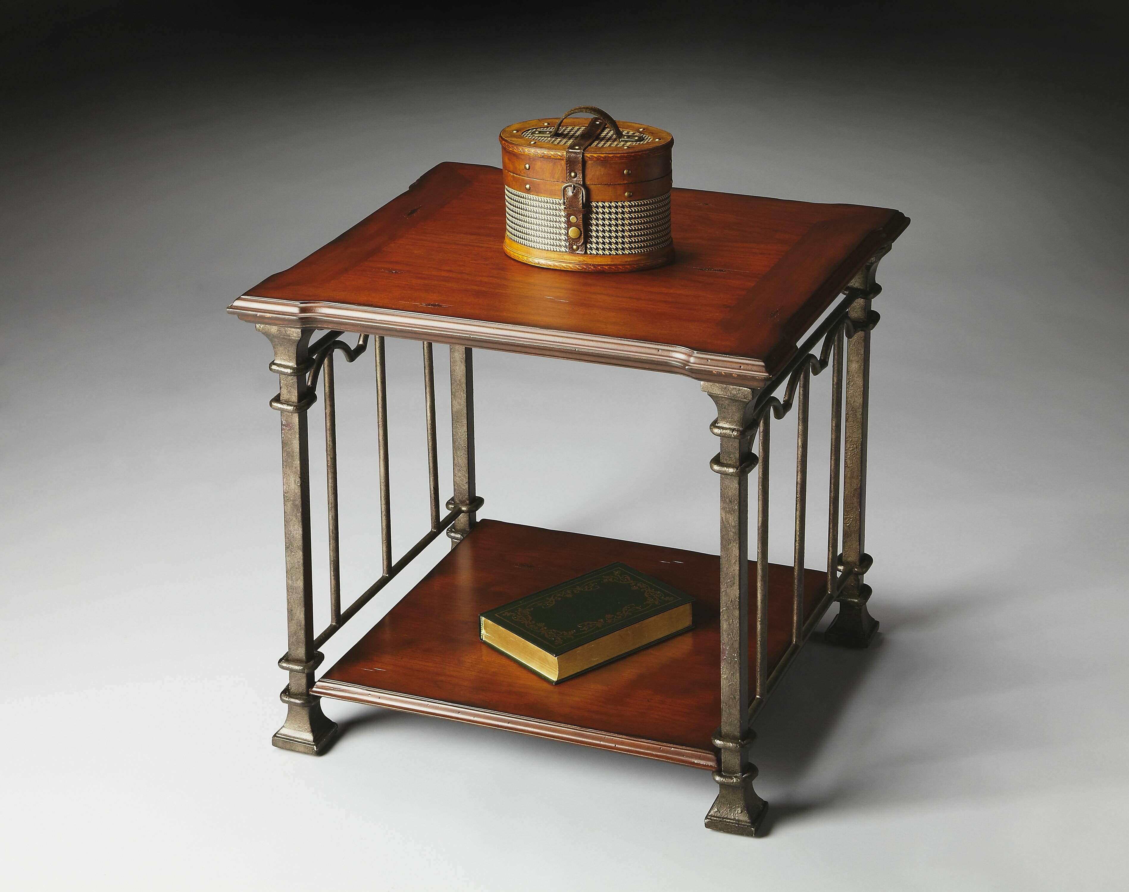 Old World elegance and modern sophistication characterize this inviting end table. Featuring a heavily distressed cherry veneer top and lower display shelf, it is crafted wood products and a hand forged pewter finished metal base. Some Minor Assembly Required. Ships via UPS/FedEx