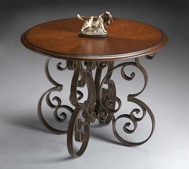 Selected solid woods, wood products and choice cherry veneers. Physically distressed four-way matched cherry veneer top. Finished metal base. Some Minor Assembly Required. Ships via Freight Truck