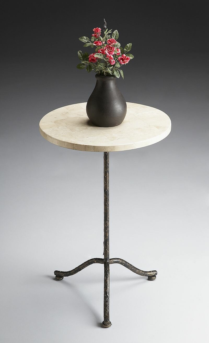 Finished metal base. Cream fossil stone veneer top. Fully Assembled. Ships via UPS/FedEx