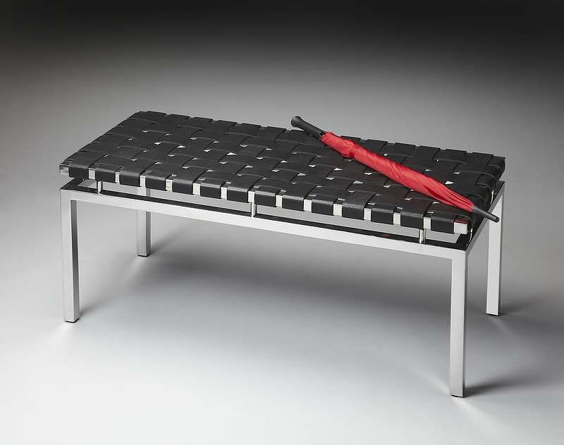 This modern bench is destined to provide engaging elegance to your space. Forged from steel, it features a woven black leather seat and a daring stainless steel finish. Part of the Modern Expressions Collection. Non-Distressed Finish. Comes Fully Assembled. Ships via FedEx/UPS.