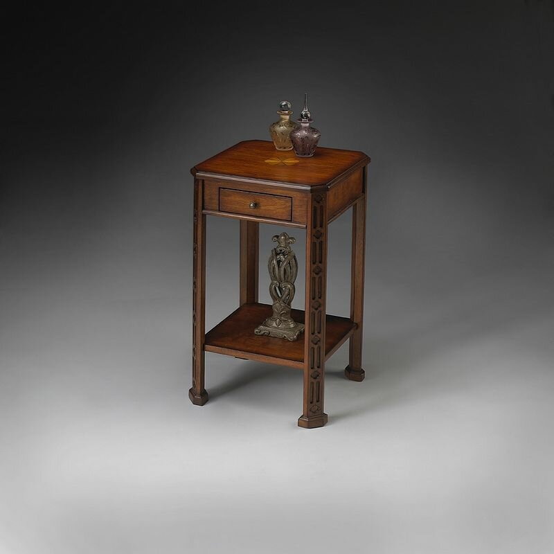Selected solid woods and choice veneers. Hand carved details. Cherry veneer top with maple veneer inlay design. One drawer with antique brass finished hardware. Some Minor Assembly Required. Ships via UPS/FedEx