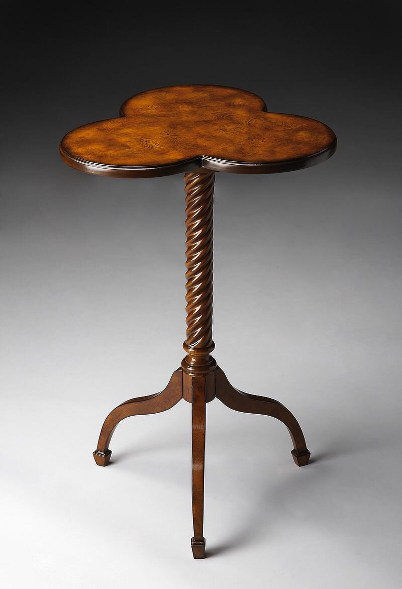 This striking table is crafted from hardwood solids, wood products and choice olive ash burl veneers. Features a clover shaped top with olive ash burl veneers and an elegant twist base. Some Minor Assembly Required. Ships via UPS/FedEx