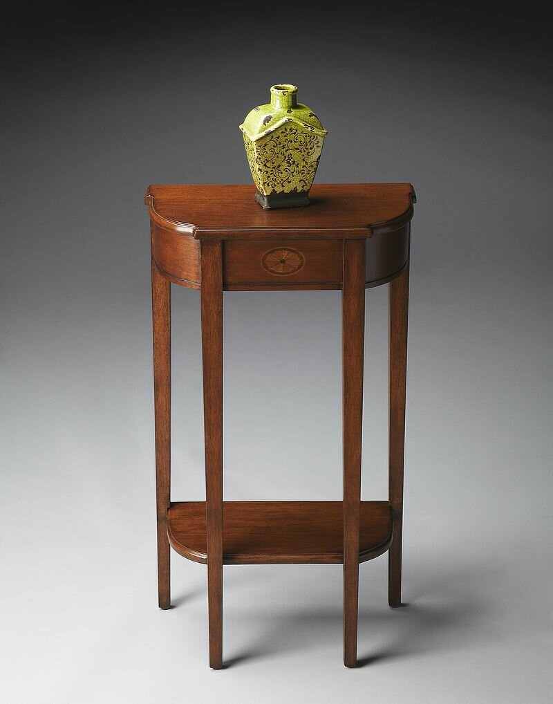 A spot of elegance for a small space, this Console table’s harmonious design begins with the slender legs, gracefully tapered. The beautiful symmetry of tabletop and bottom shelf adds to the effect, which is consummated in the linen-fold inlay on the front and the gleaming Olive Ash Burl finish on the cherry veneer. Some Minor Assembly Required. Ships via UPS/FedEx