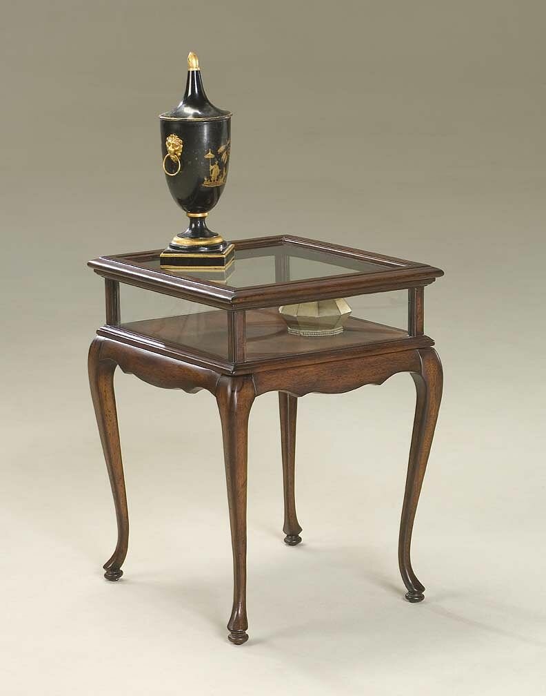 Selected hardwoods and choice cherry veneers. Cherry veneer on display surface and aprons. Glass sides and hinged glass framed top. Some Minor Assembly Required. Ships via UPS/FedEx