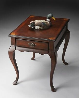 Selected solid woods, wood products and choice veneers. Features a matched cherry veneer top with maple and walnut veneer linen-fold inlaid designs at each corner. Drawer with antique brass finished hardware. Some Minor Assembly Required. Ships via UPS/FedEx