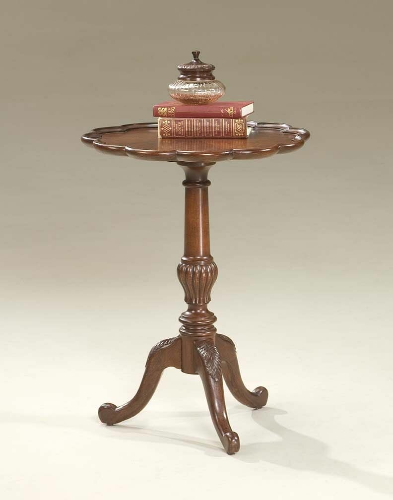 Selected solid woods and choice cherry veneers. Four-way matched cherry veneer top with pie crust frame. Resin appliqués. Some Minor Assembly Required. Ships via UPS/FedEx