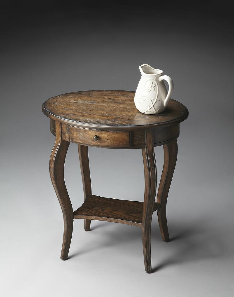This graceful accent table is a wonderful addition to virtually any space. Crafted from hardwood solids, wood products and choice veneers, it features a vibrant hand-rubbed, distressed finish over cherry veneers. Includes one drawer with antique brass finished hardware and a lower display shelf. Some Minor Assembly Required. Ships via UPS/FedEx