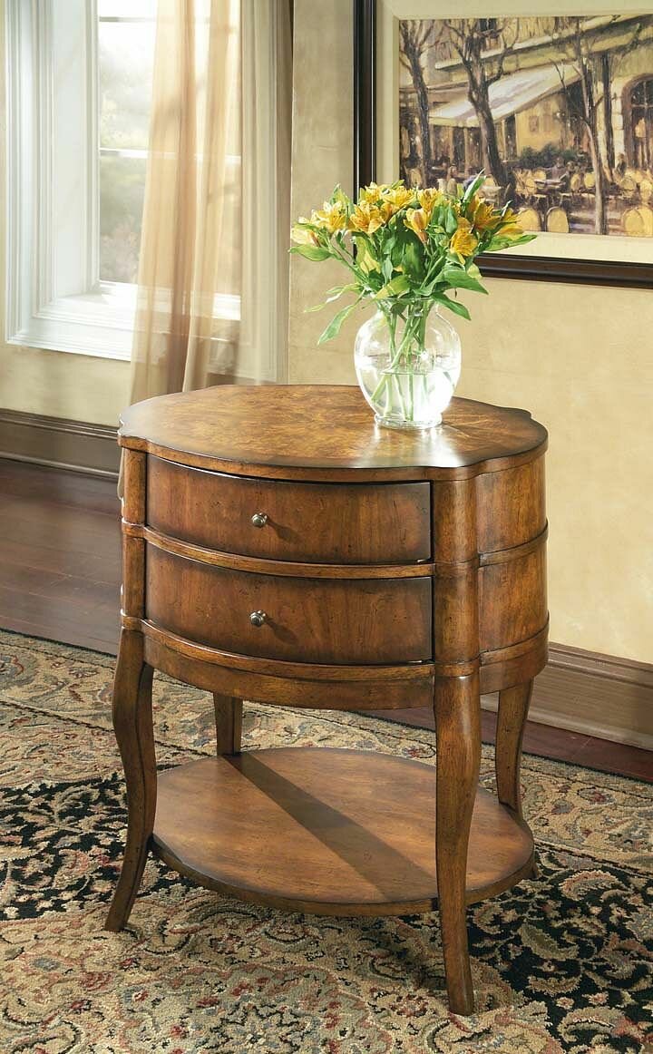 Made of select hardwoods and choice veneers. Olive ash burl veneer on top and drawer fronts. Two drawers with antique brass finished knobs. Some Minor Assembly Required. Ships via UPS/FedEx