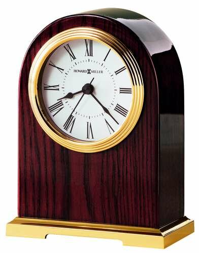 The Carter Table Clock by Howard Miller is a high-gloss, Rosewood Hall finished table clock on select hardwoods with a polished brass-finished base. Features a white dial with polished-brass-tone bezel and black numerals.
