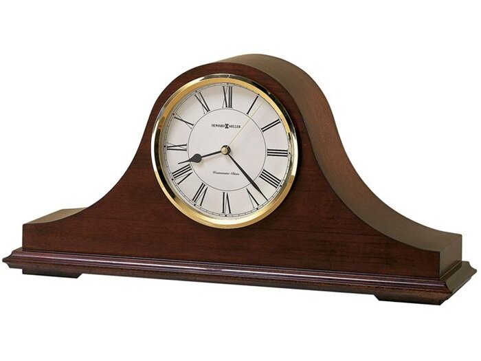 The Christopher Mantel Clock by Howard Miller is finished in Windsor Cherry on select hardwoods and veneers.