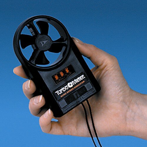 The Turbo Meter provides uncommon accuracy, sensitivity, and pocket-sized convenience. It is based on the principle that a freely turning turbine will rotate at a speed directly proportional to the wind speed. To insure maximum sensitivity and accuracy, the turbine is suspended on sapphire jewel bearings, and its rotation is sensed by an infrared light beam which adds no friction. The resulting signal is processed electronically by an LSI (Large Scale Integrated) circuit for improved reliability and reduced size. A special three digit display is used for extra resolution and provides excellent viewing contrast in bright sunlight. A handy switch selects between four different scales knots, feet per minute, meters per second, and miles per hour for unmatched versatility. Unit is compact size (2.6 x 4.7", 7x 12cm) and light weight ( 3oz., 85g).
