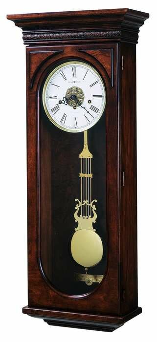 • Polished-brass pendulum accented by a decorative burl back panel and beat plate.