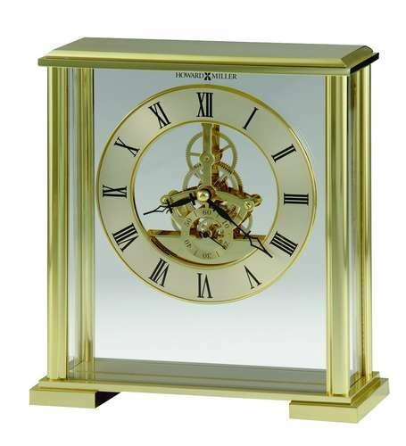 The Fairview Table Clock by Howard Miller is a brushed and polished brass-finished metal table clock with glass front and side panels.