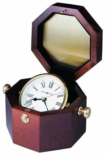 The Oceana Weather and Maritime Clock by Howard Miller is a Polished-brass, gimbaled captain's clock housed in a Windsor Cherry finished, felt-lined octagonal chest, with polished-brass hardware.