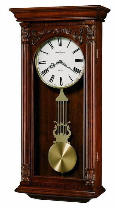 The Greer Wall Clock by Howard Miller has a Hampton Cherry finish on select hardwoods and veneers.
