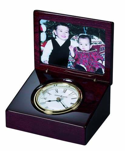 The Hayden Table Clock by Howard Miller is a wedge-shaped table clock featuring a photo frame on inside of hinged lid.