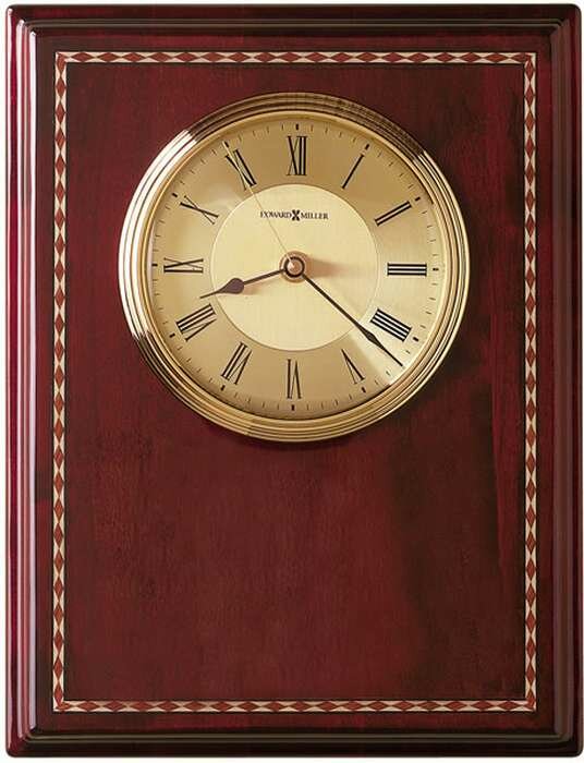The Honor Time II Plaque by Howard Miller is a high-gloss, Rosewood Hall plaque with decorative marquetry, profiled edge, and polished brass-finished dial and bezel.