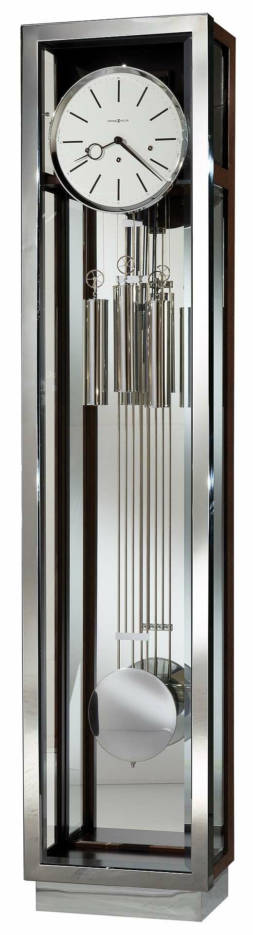 • The polished chrome-finished grid pendulum adds to the linear appeal of the clock.
