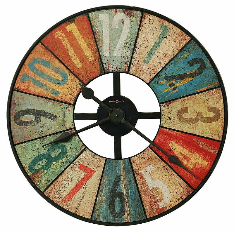 • This unique oversized wall clock features an aged background with multi-colored panels and Arabic numerals in various colors.