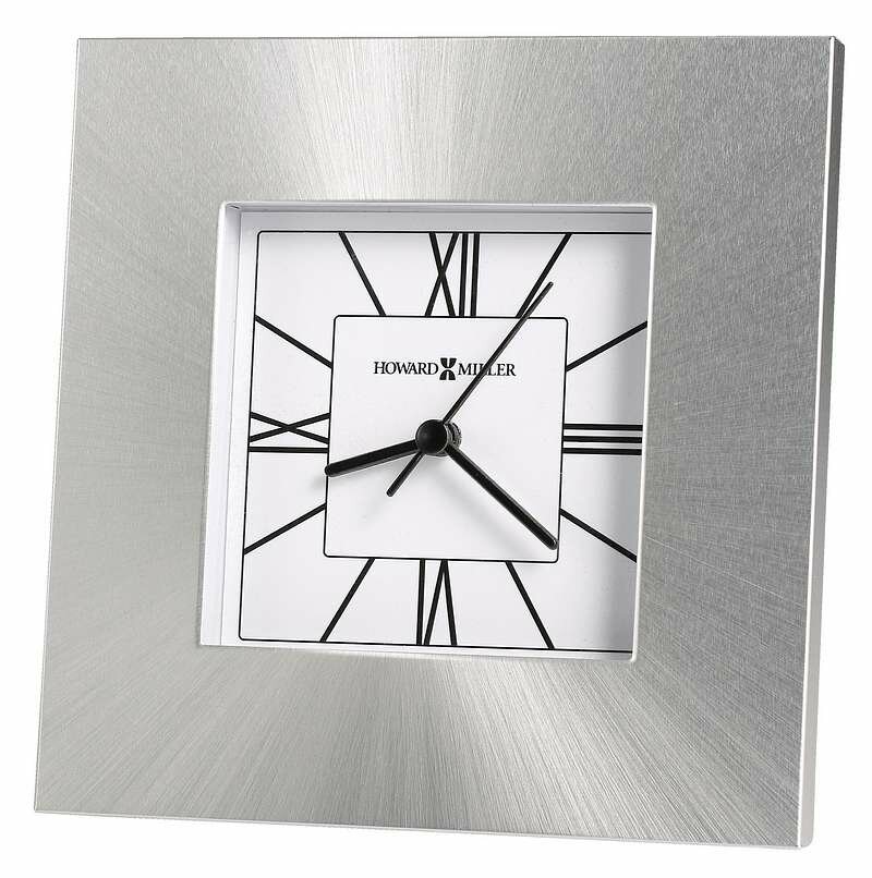 • This square aluminum tabletop clock features a brushed sunburst, silver finish.