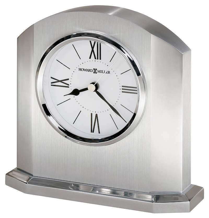 • This handsome, silver-finished arched alarm clock features a solid aluminum case with polished beveled sides and a brushed aluminum base with beveled and polished sides and edges.