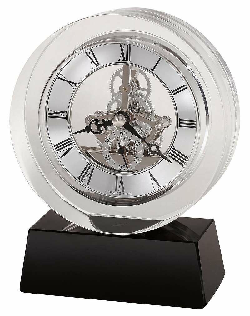 • This striking optical crystal table clock features a round crystal clear case that sits on top of a black crystal base. The floating dial highlights a polished silver-finished skeleton movement visible in the center.