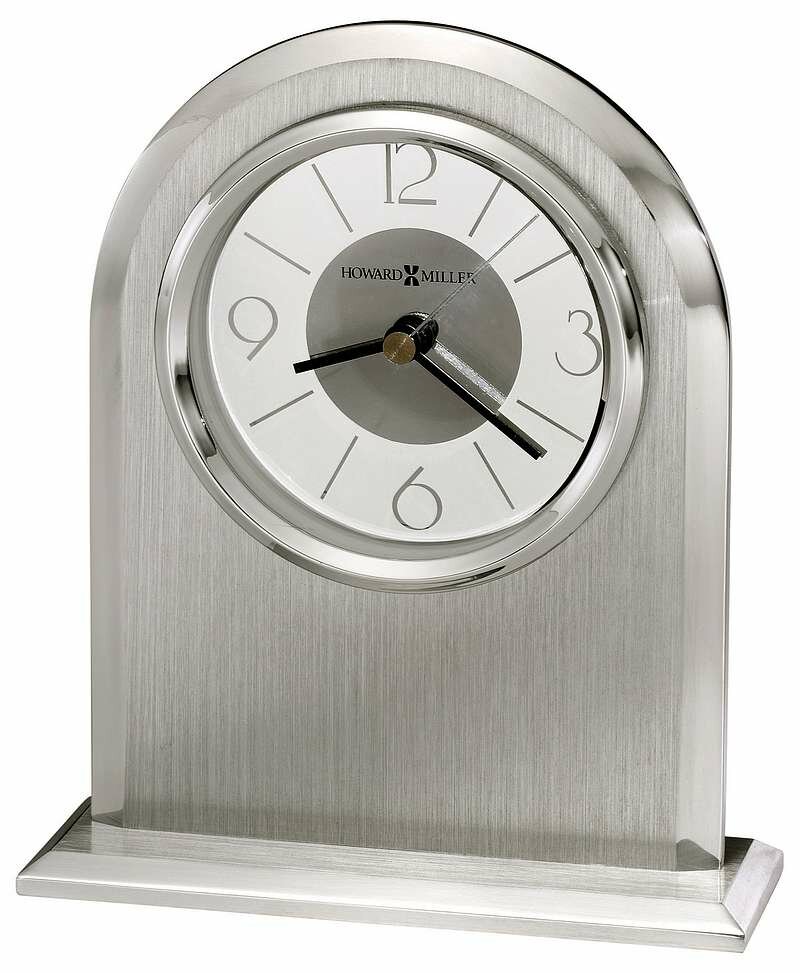 • Contemporary brushed and polished silver-finished arch tabletop clock with polished beveled edge, sits on a brushed aluminum finished base with polished beveled edges.