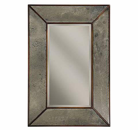 • This beveled glass mirror is surrounded by antiqued mirrored panels outlined by an antique bronze frame.