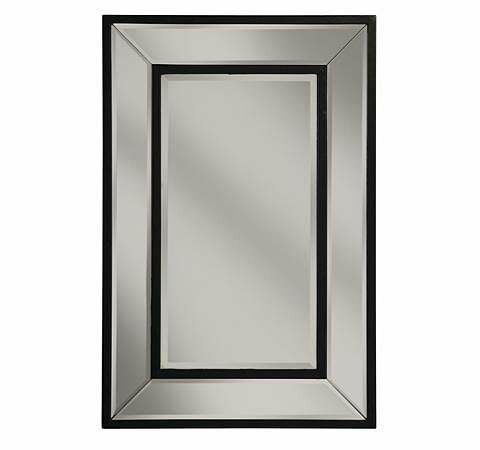 • This beveled glass mirror is surrounded by beveled glass mirrored panels outlined by contemporary black satin inner and outer wood frames.