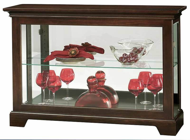 • This curio console cabinet features side opening doors on the left and right sides of cabinet and beveled glass on the front.