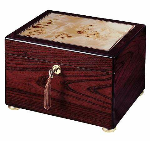 • Memorial chest featuring a high-gloss finish with contrasting inlaid burl on the top and velvet-lined
