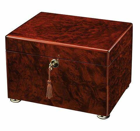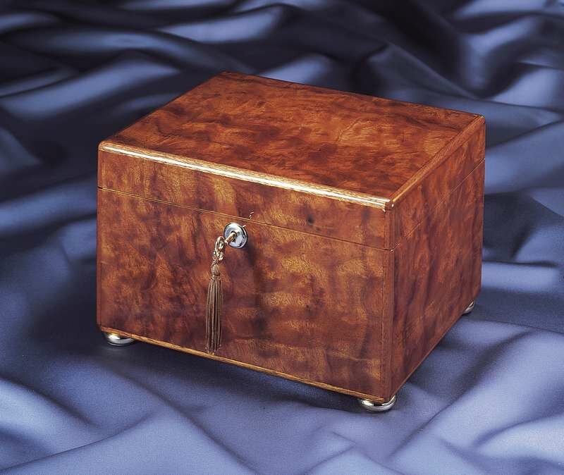 • Brass hinges and feet, and a brass finished key with decorative tassel and a velvet-lined